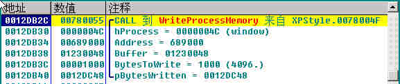 0012DB2C 00780055 /CALL 到 WriteProcessMemory 来自 XPStyle.0078004F ; 在这里跟随。