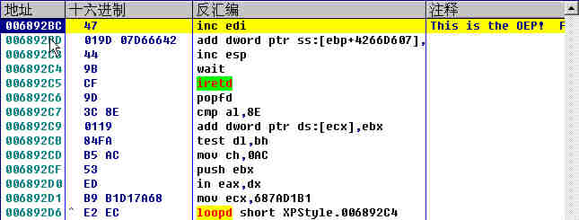 得到:OEP=6892BC PID=0958