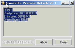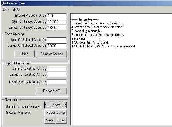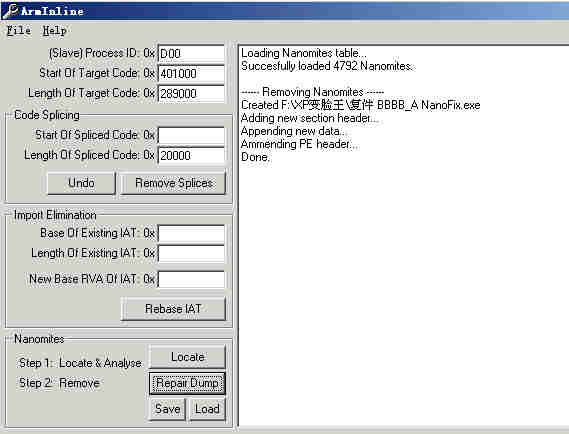 重新运行程序,从文件-->附加-->得到PID=D00。Load-->CCCC.nan,“Repair Dump”,选择修复的脱壳程序,修复成功。