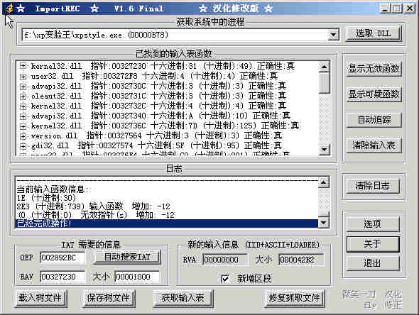 打开RecImport,选PID进程,OEP=002892BC RVA=00327230 Size=1000,获取输入表。