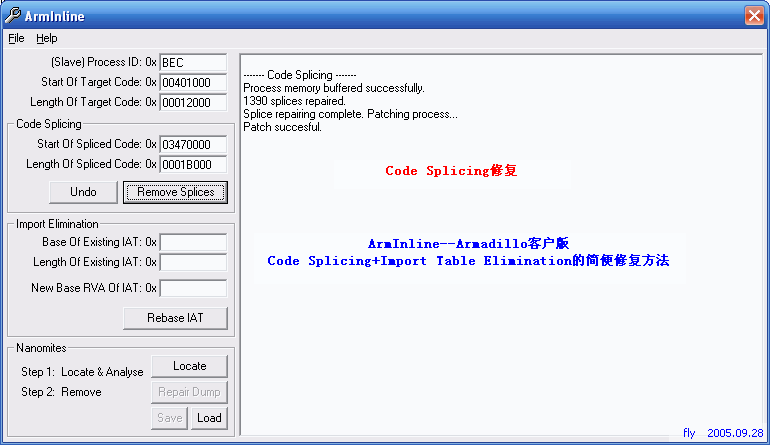 Code Splicing通常称为远程地址,Armadillo会把程序中的部分代码挪移到壳申请的内存段运行,普通dump会导致此部分代码丢失。以前有两种解法:①、修改VirtualAlloc返回地址,使其把挪移的代码放到无用的壳区段;②、Dmp后补上那个包含挪移代码的壳申请的内存段。
