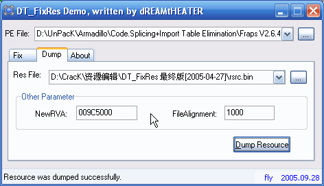 运行ResFixer打开未优化的dumped.exe,看到各资源项都是完好的,如果有问题ResFixer会以红色来显示,我们所要做的是把Resource的RVA调整一下,在Section RVA填入009C5000(00015000+009AF618=009C4618,取整=009C5000),File Alignment一般是00001000,Rebuild Method选择Method 1(Cut And Paste),点击“Rebuild”,得到.rsrc文件。