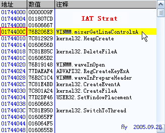 在程序中随便找个API调用,在数据窗口中察看IAT的开始和结束地址。
