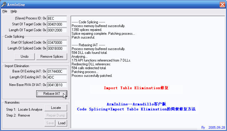 脱壳过程: 前几天看到hacnho在exetools发的《Code Splicing+Rebase IAT: GameJack 5.0》教程,推荐的Armadillo脱壳辅助工具ArmInline很不错。找了Gamejack V5.0.4.1脱壳练习,Gamejack没有使用Import Table Elimination。