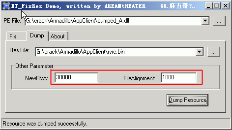 ----------------------------------------------------------------------------------------------------------- 在OD中单独测试脱壳dll,能准确停在入口点,F9运行,初始化完成。 一般dll脱壳后,必须和主程序联调,才能知道脱壳是否成功。改脱壳dll为程序规定文件名,运行主文件,测试各功能菜单,OK,成功。实际上这个dll是有关“狗”的调用。看来这个dll的重定位表没有加密,不再修复重定位表。修复后的dumped_.dll字节为920K,加壳版为576K,原版为176K。优化dumped_.dll文件,应该基本和原版的176K接近。 1、用FixRes转存资源段rsrc区段,NewRVA=00030000,既原text1的虚拟地址,字节大小:FileAlignment=1000,转存为rsrc.bin。