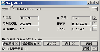 6、从磁盘载入资源段mackt区段,不重建PE。 最后测试:文件字节=205K,编程语言=Microsoft Visual C++ 6.0 DLL。
